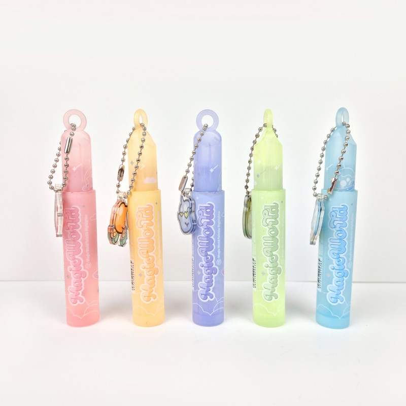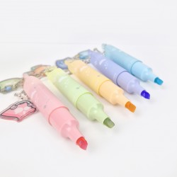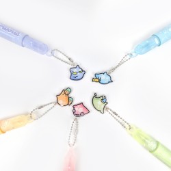 Este resaltador Kawaii destaca por su diseño compacto en tonos pastel y su adorable dije colgante. Es práctico para llevar en estuches o mochilas gracias a su cadena metálica. Perfecto para resaltar textos y dar un toque creativo a tus apuntes o journals.